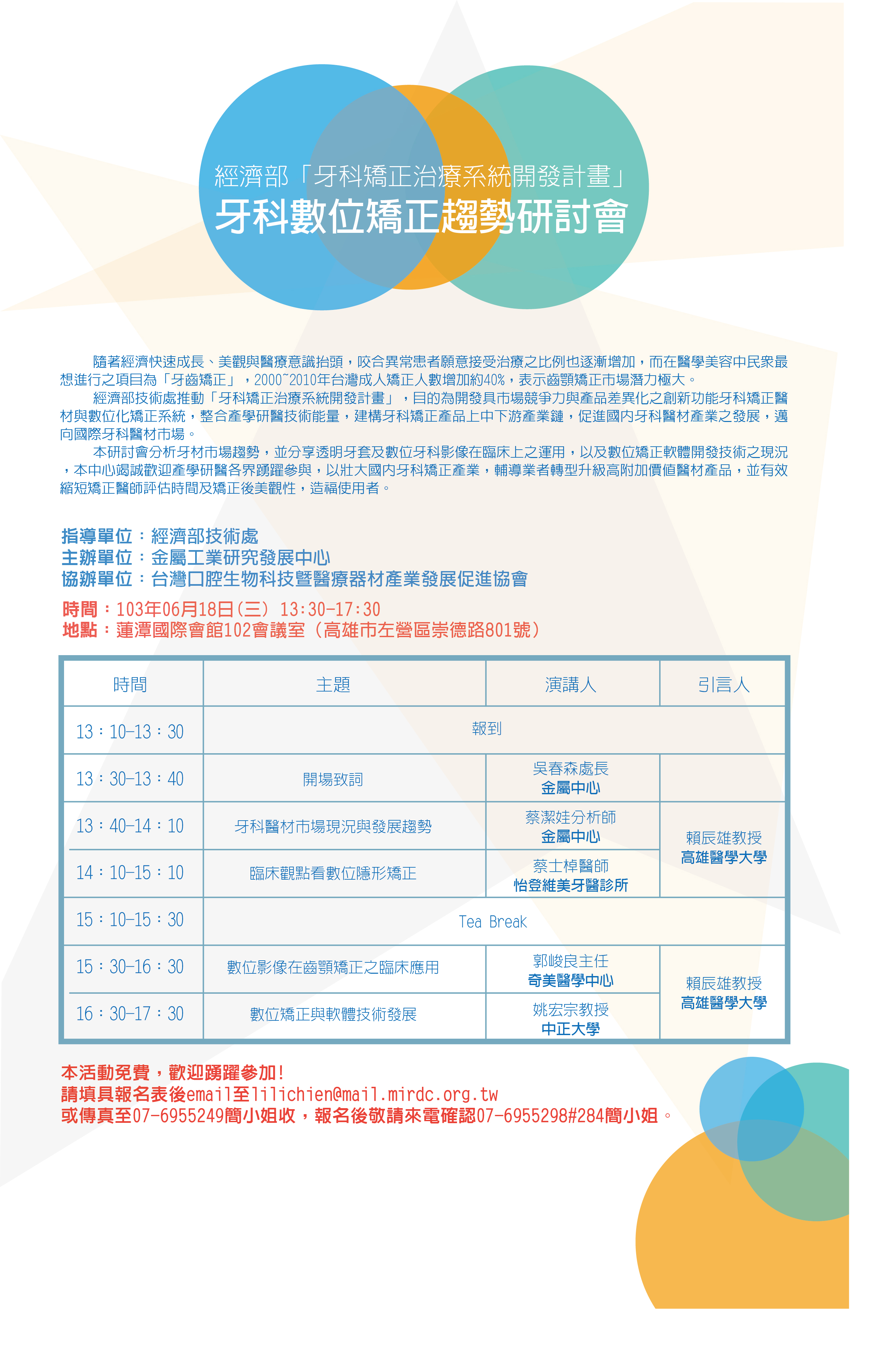 本研討會分析牙材市場趨勢,並分享透明牙套及數位牙科影像在臨床上之運用,以及數位矯正軟體開發技術之現況,本中心竭誠歡迎產學研醫各界踴躍參與,以壯大國內牙科矯正產業,輔導業者轉型升級高附加價值醫材產品,並有效縮短矯正醫師評估時間及矯正後美觀性,造福使用者。