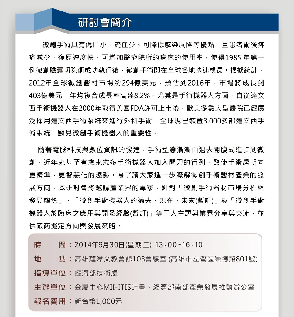 敬邀參加9/30金屬中心主辦「微創手術器材產業暨手術機器人趨勢展望研討會」,儘早報名即可享報名優惠!