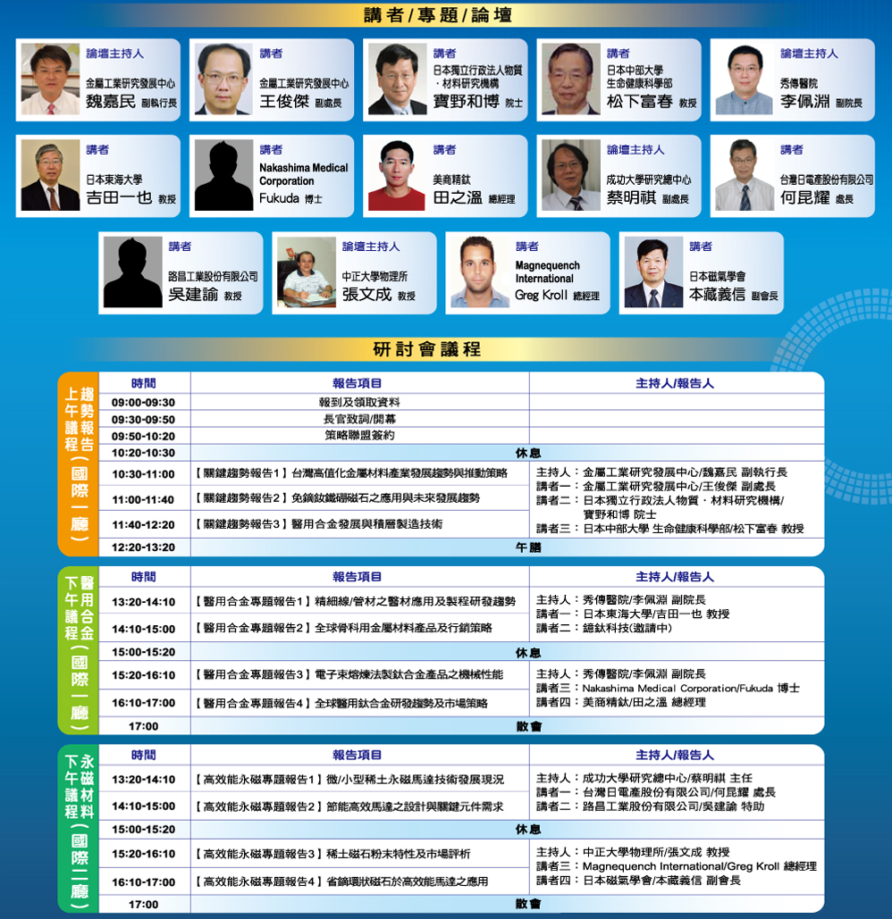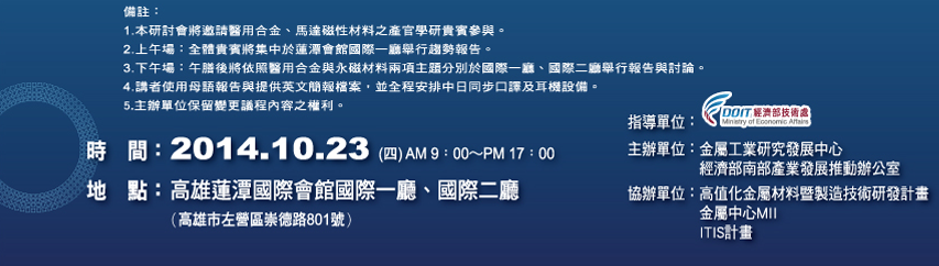 敬邀參加10/23金屬中心與南部產業發展推動辦公室主辦「2014高值化金屬材料國際研討會-醫用合金暨永磁材料前瞻應用」,免費參加,名額有限,請踴躍參加!