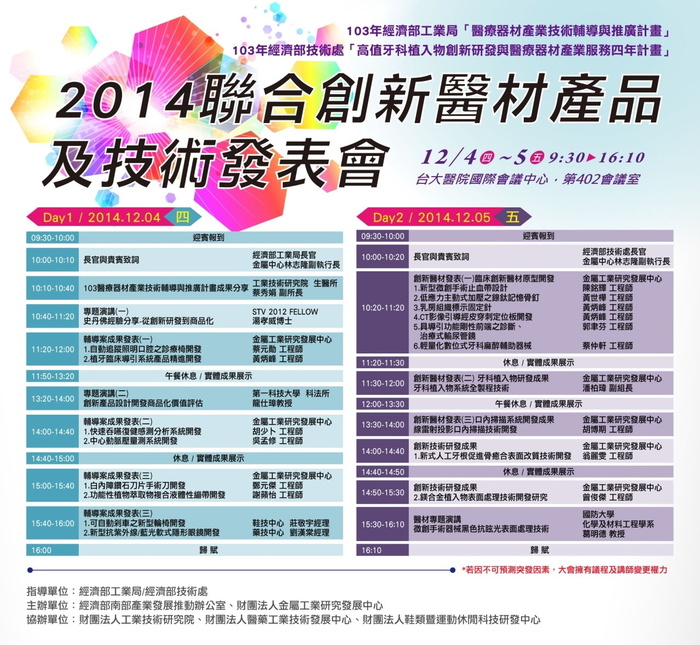 「2104聯合創新醫材產品及技術發表會」12月4、5兩日在台大醫院國際會議中心舉辦,免費入場。 金屬中心/提供